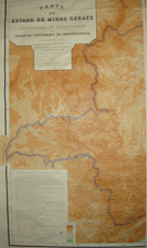 Carta do Estado de Minas Gerais - 1922 Confecccionado em Commemoração do 1º Centenário da Independência sendo presidente o Exmo Sr. Dr. Artur da Silva Bernardes sendo secretário da agricultura o Exmo. Sr. Dr.Clodomiro de Oliveira e director da agricultura o Exmo. Sr. Dr. Alvaro da Silveira Escala 1/1.000.000 Edição provisória; uma das cartas tem algumas colagens; dimensão: 70x123 cm |