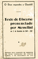Texto do Discurso Pronunciado por Mussolini em 2 de Dezembro de 1942 - 1942 O Duce respondeu a Churchill Editado pelo gabinete de imprensa da rial legação de Itália broch; 37 pág. com assinatura de posse na folha de rosto |