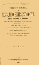 Colecção Completa de Legislação Eclesiastico- Civil - 1896 desde 1832 até ao presente João M. Pacheco Teixeira Rebello Delegado do Procurador Regio 1º Vol. capa meia inglesa (danificada na parte inferior) |